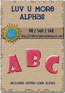 As promised in my previous post, here are the alphas (upper-case only) to match the word art in my "Luv U More" kit. You can download them HERE. The full kit is on sale at my store for 50% off through Sunday.